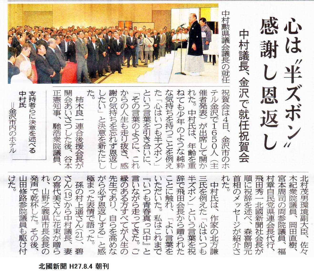 知事の祝辞では、「議長就任祝賀会でこれだけ多人数が参列するのは経験がない。議会質問で中村議員が質問されるときは傍聴席が常に満員。熱心な支持者が多いということは誠実な人柄がそうさせている・・・・・」と述べられた。